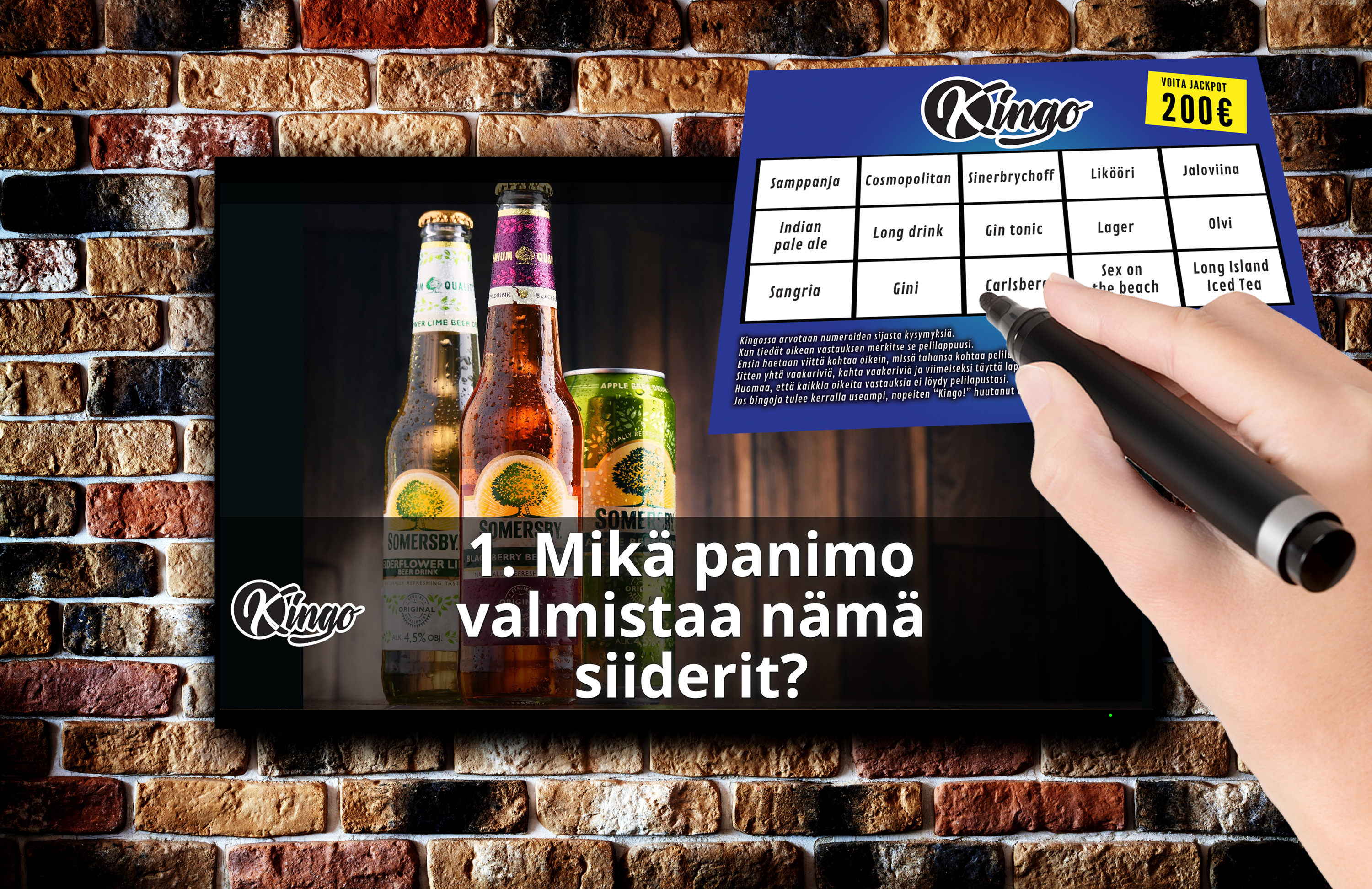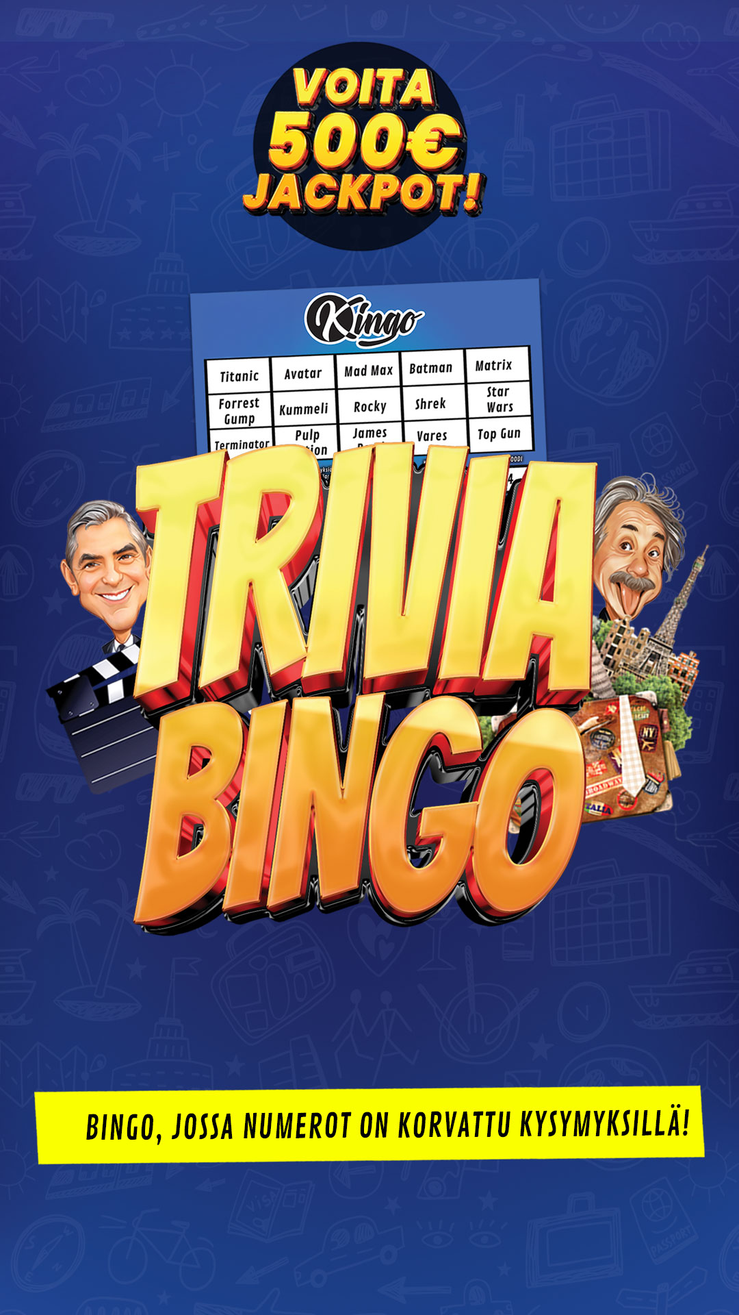 Kingo yhdistää tietovisan ja bingon hauskaksi peliksi. Numerot on korvattu vastauksilla, joita rastitat oikeiden kysymysten kohdalla. Ei haittaa, vaikka et tietäisi kaikkea – oikeat vastaukset paljastetaan, joten jokainen voi olla voittaja!